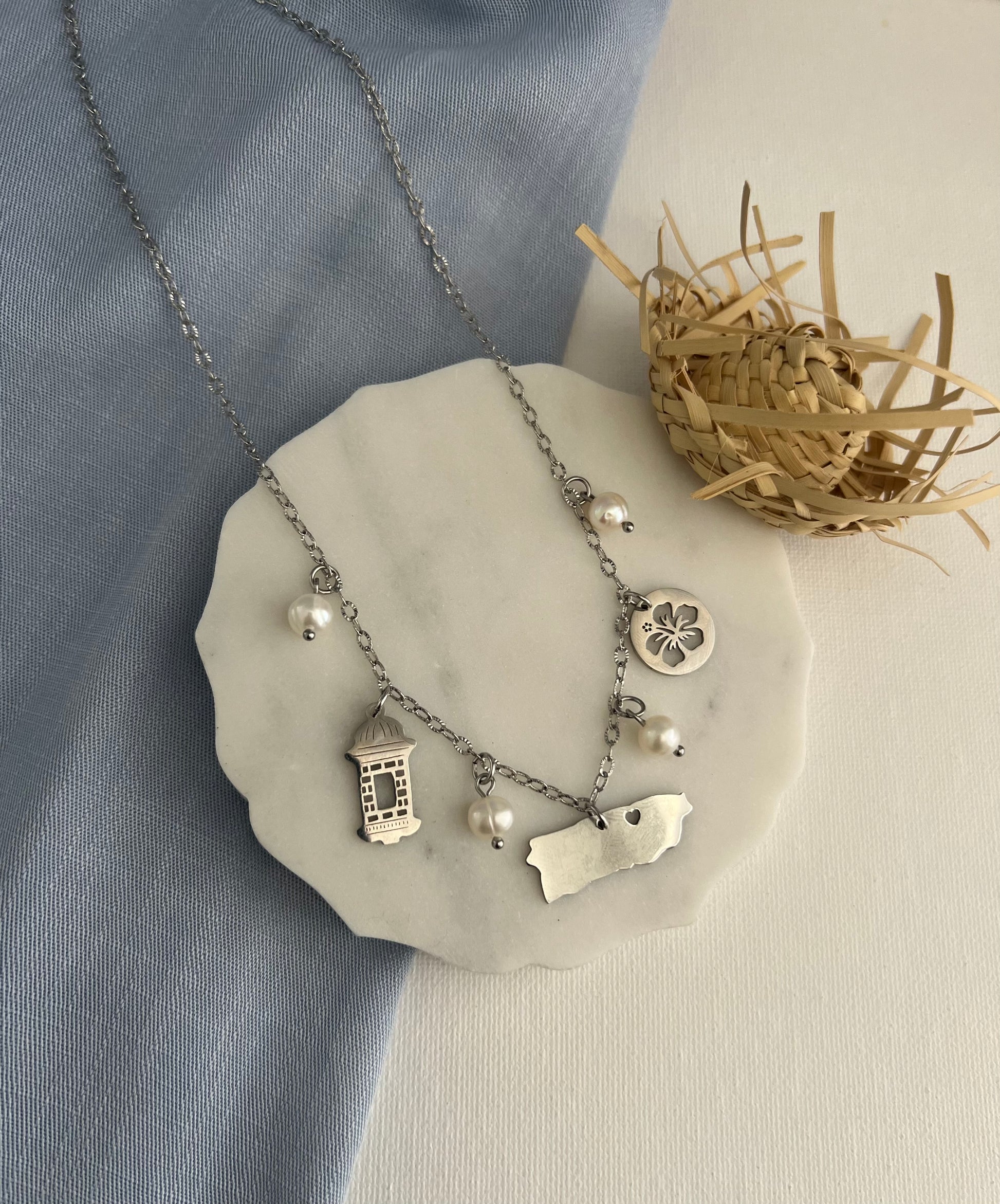 Collar con múltiples charms en acero inoxidable y perlas genuinas. Largo ajustable pasta 17”