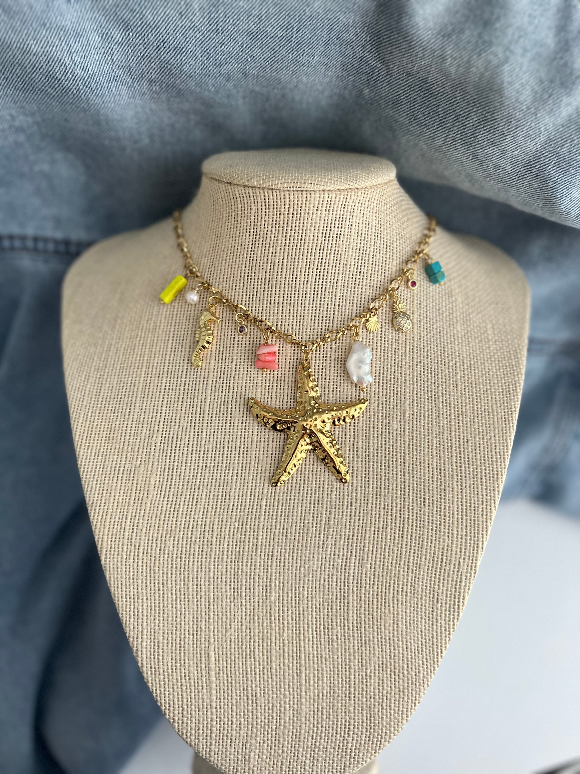 Collar de cadena en acero inoxidable dorado de 17.5” de largo, diseñado con una composición de charms marinos y detalles coloridos.