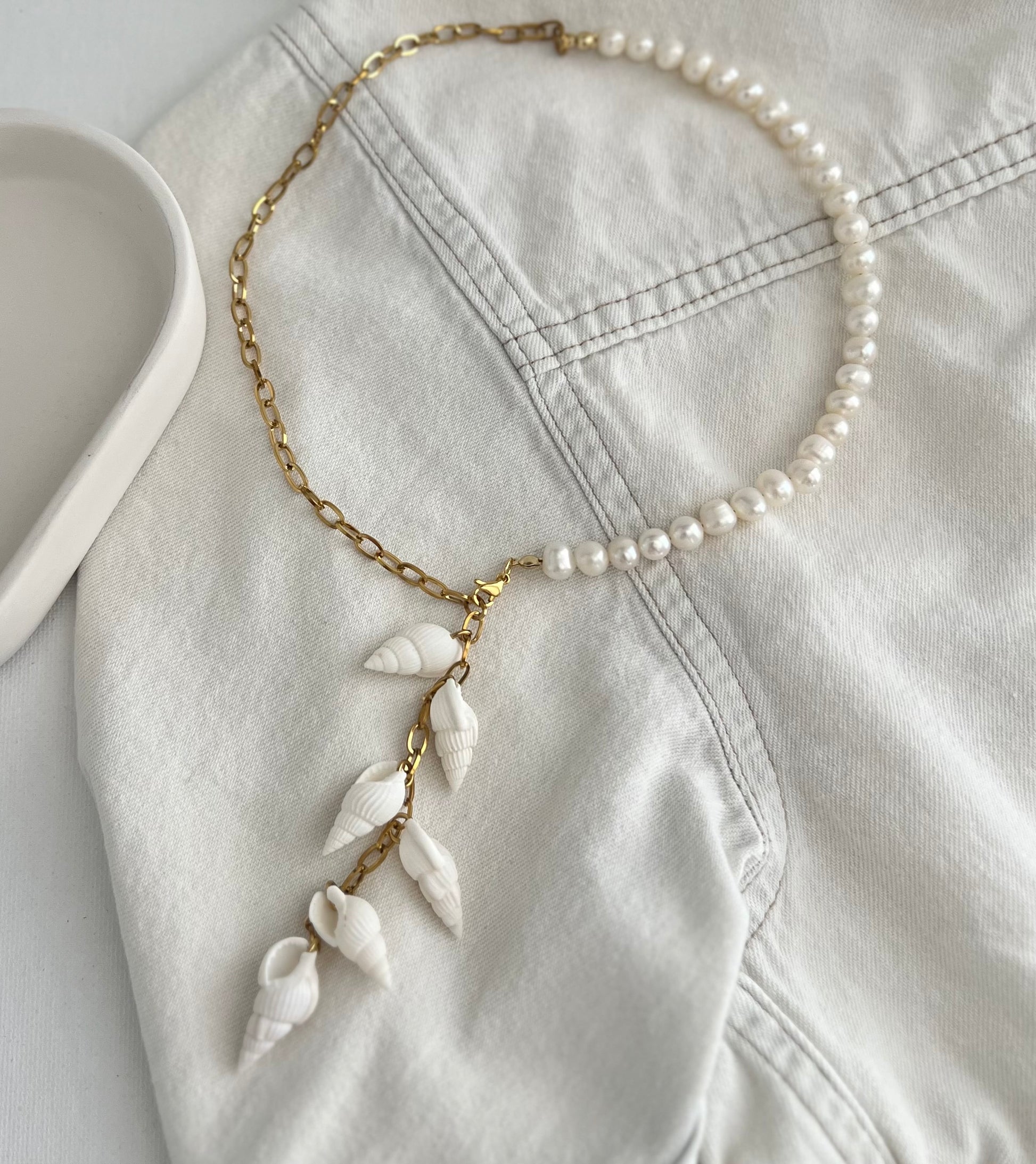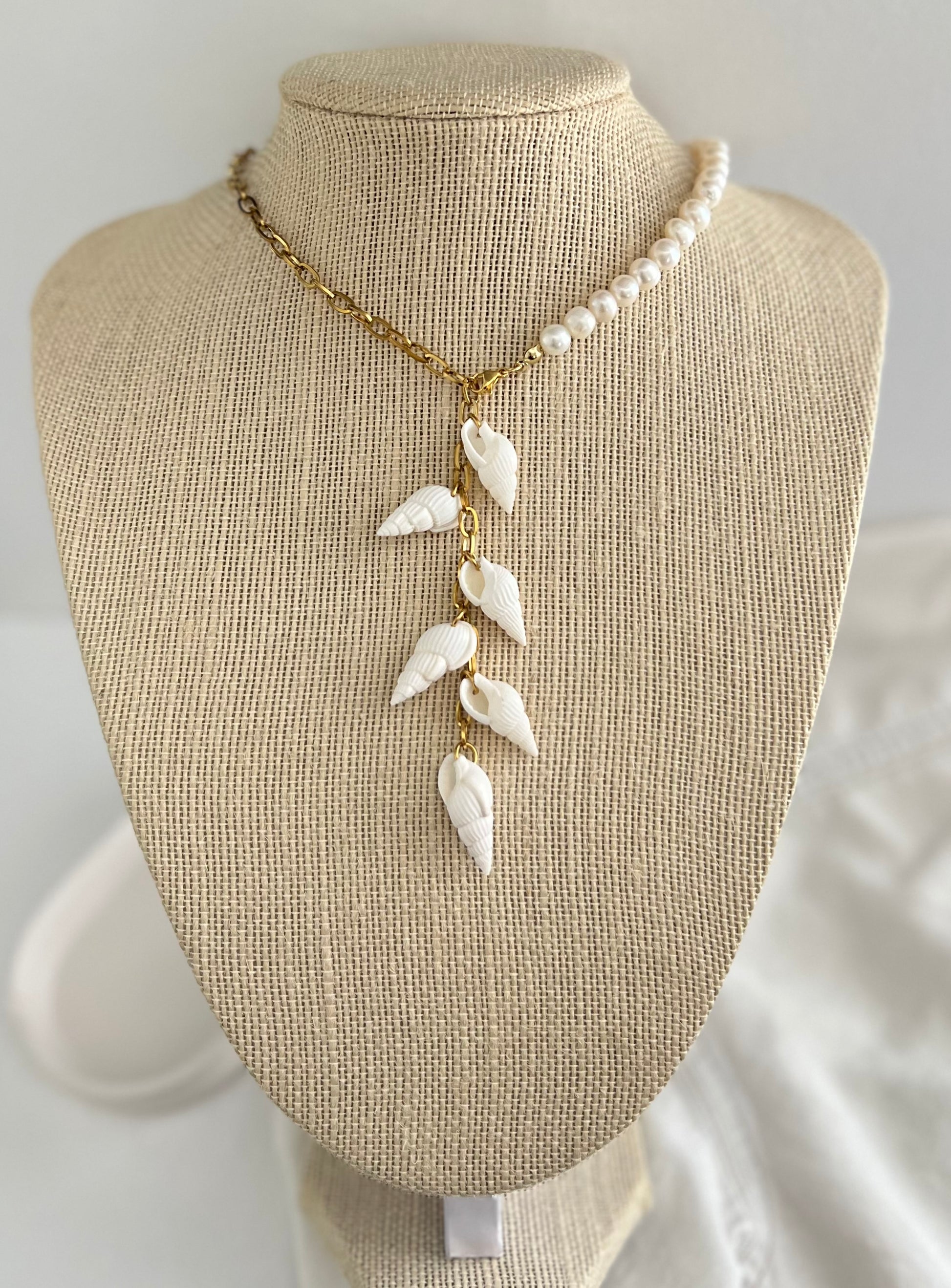 Inspirado en la belleza natural de las playas puertorriqueñas, este collar combina elegancia y frescura en un solo diseño. Elaborado con perlas genuinas y caracoles reales, cada pieza es única y especial. La mezcla de cadena dorada y caída de caracoles crea un look asimétrico que roba miradas y conecta con el espíritu del verano.