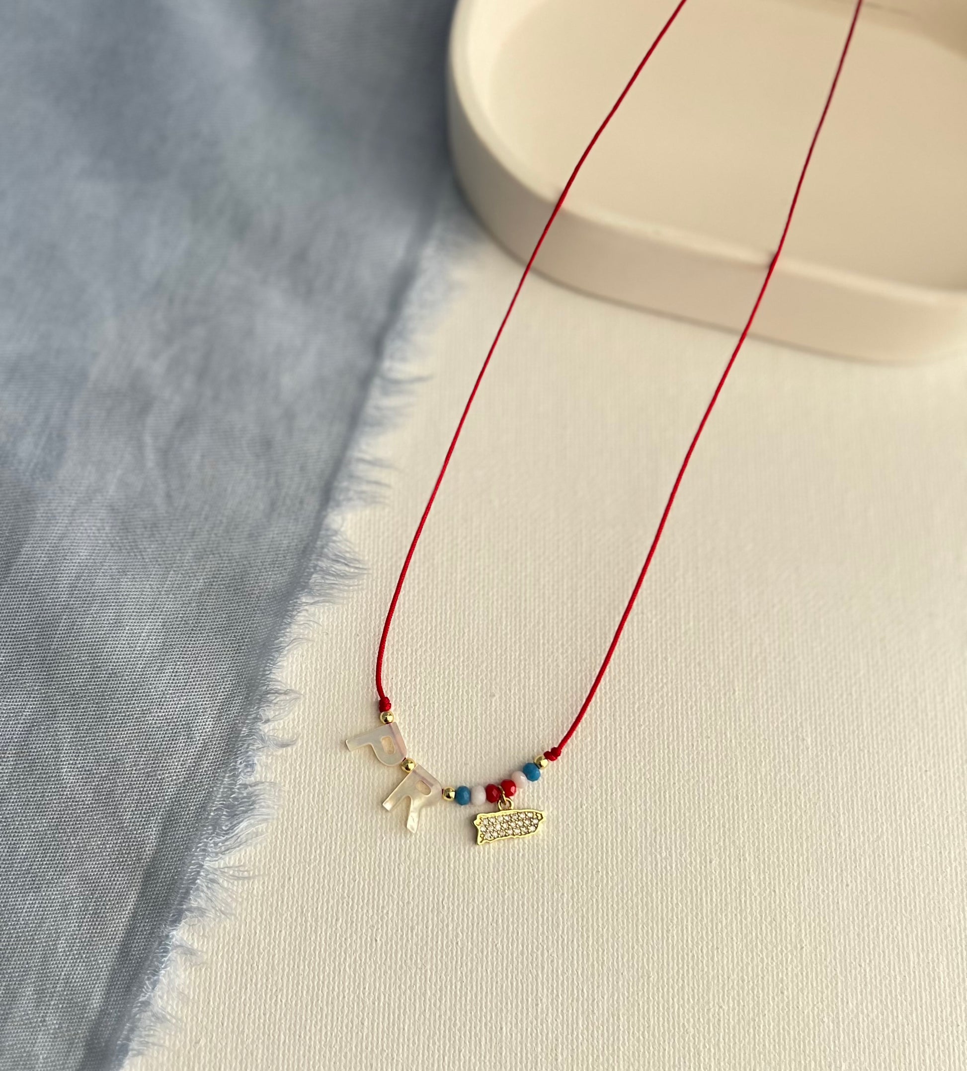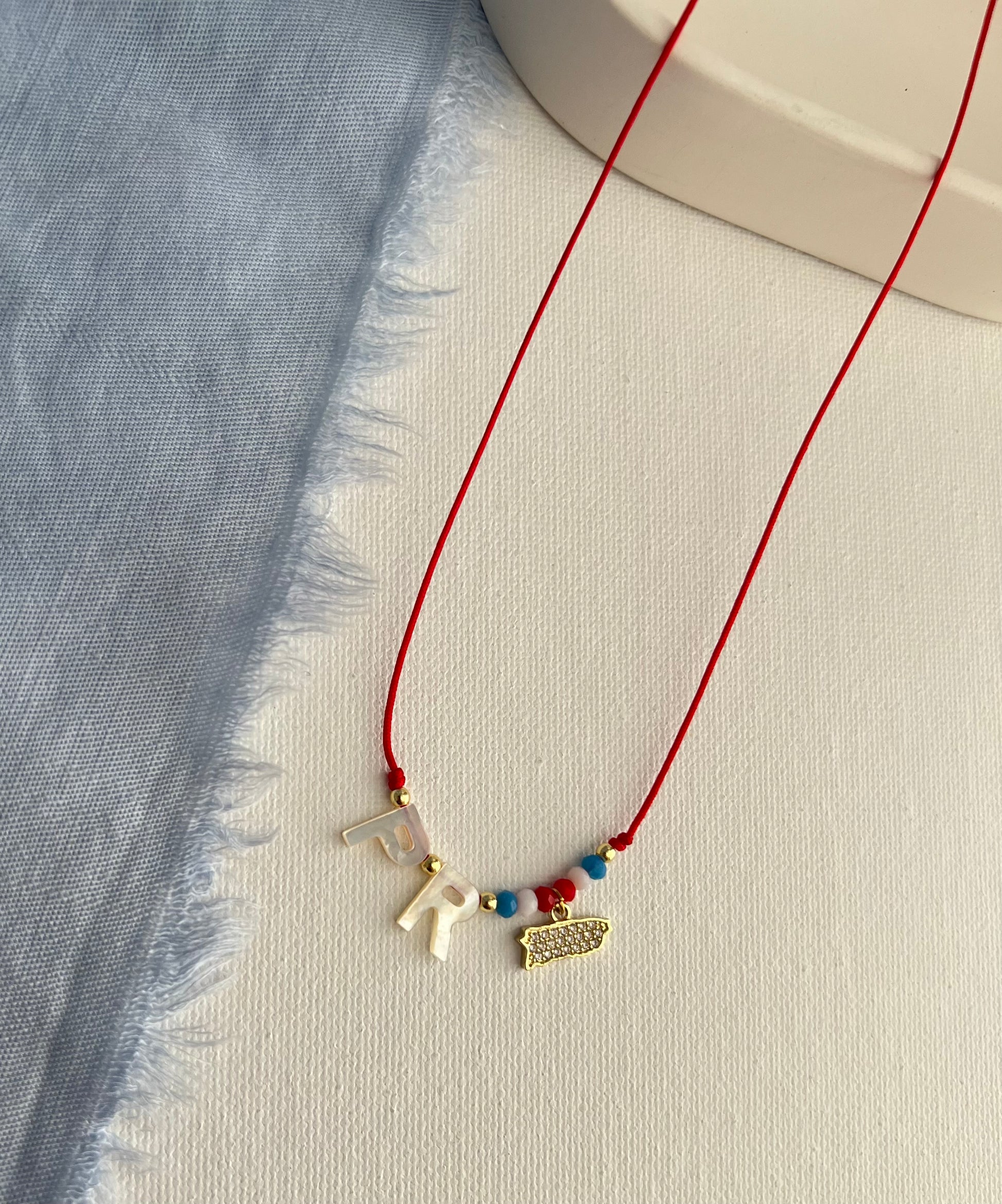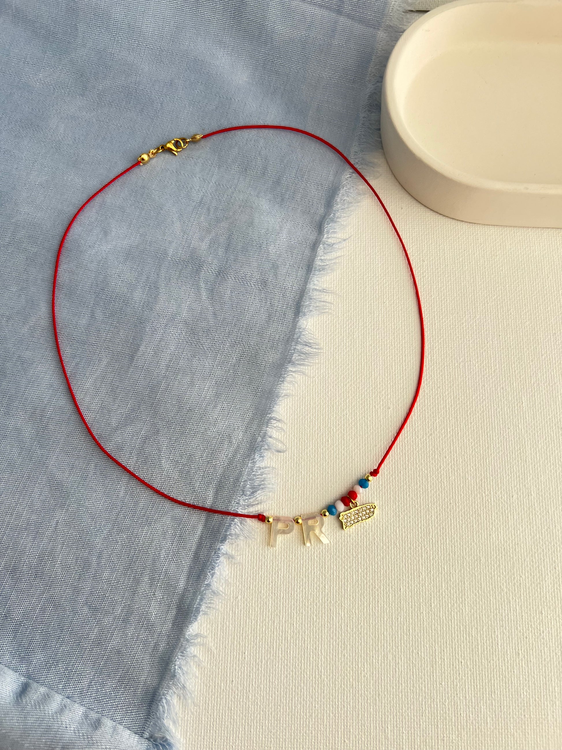 Collar en hilo rojo con letras PR en nacal y mapa en baño de oro con zirconias