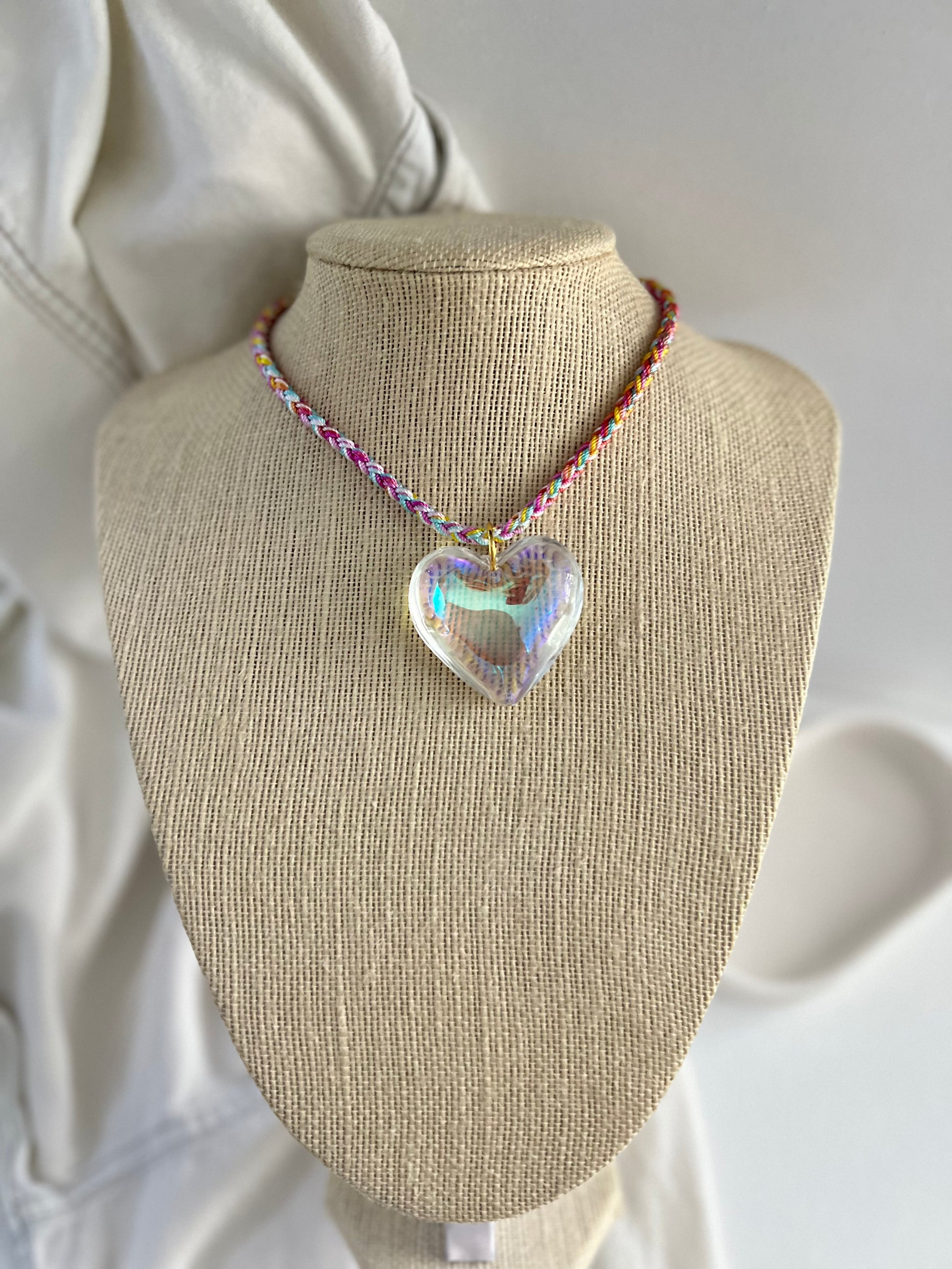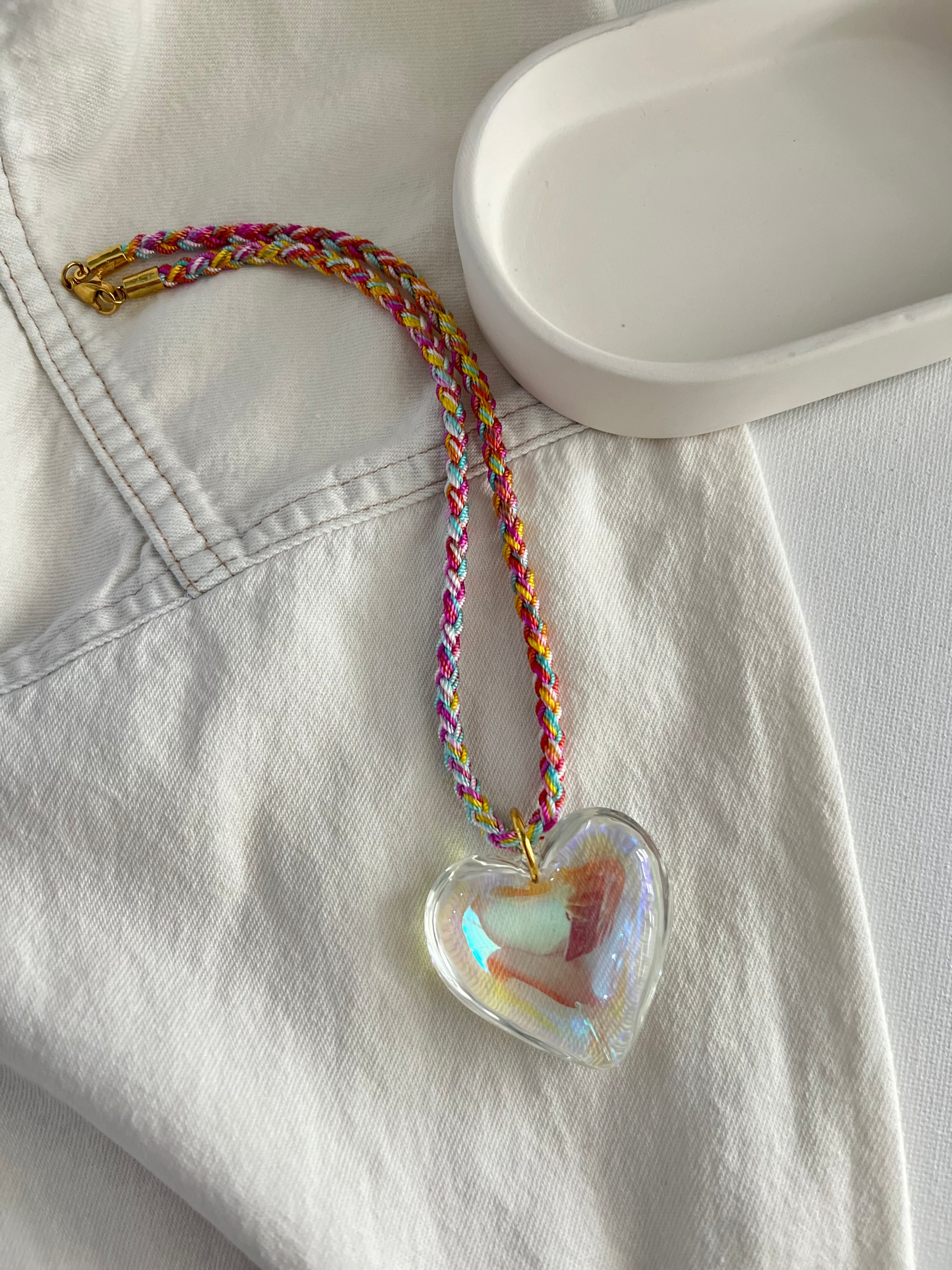Collar en hilo trenzado colorido con corazón en cristal tornasol, largo 16”